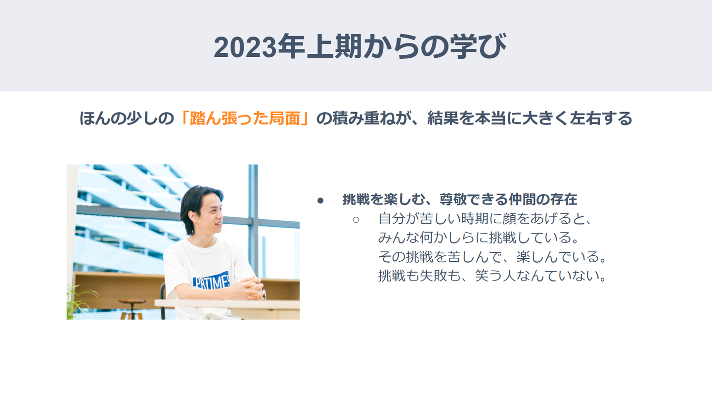 小暮:私は入社後何度か部署異動を経験したのですが、2022年に営業本部に戻ってきた時期が一番苦しかったです。私は入社翌年の2017年から役職についていましたが、2022年秋に数年ぶりにメンバーからのリスタートをきりました。正直その評価に悔しさもありましたが、2022年度は会社全体として業績が鈍化していた時期でもあったので、気持ちを切り替え営業に貢献することを決めました。