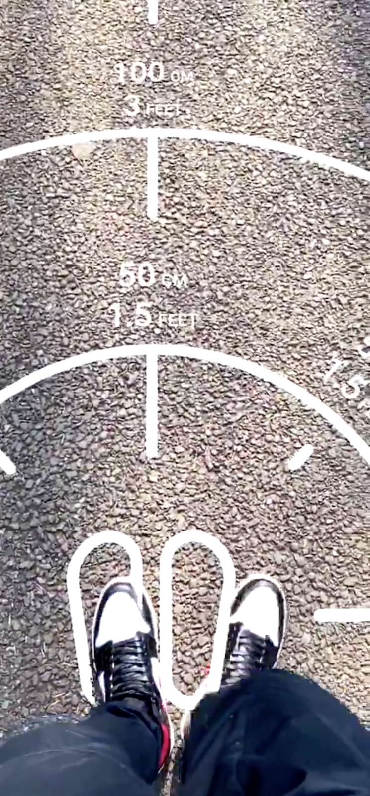 5. iPhoneで地面を認識すると、自動的に正しいサイズでARが表示されるのでARを踏む気持ちで足形に足を合わせてください。