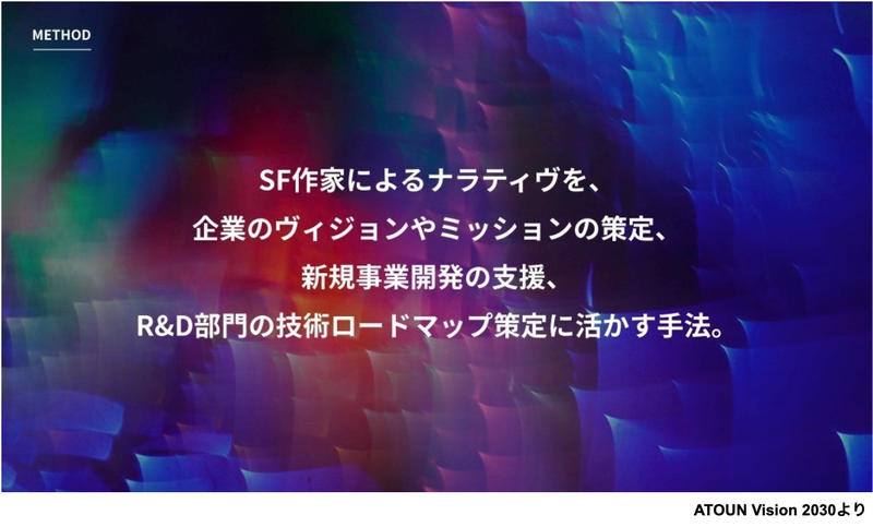 SciFiプロトタイピングをすること=会社の今後のあり⽅を考えること であることであり、ATOUNはSci-Fiからはじまった会社、ともいえます。発表された内容は、メディアでも多数紹介されていますので、ぜひご覧ください。
