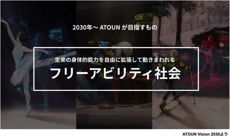 そんなATOUNがSci-Fiプロトタイピングを通して、2030年以降の「科幻」として目指すものは「フリーアビリティ社会」。フリーアビリティ社会とは、生来の身体的能力を自由に拡張して動き回れる社会のこと。