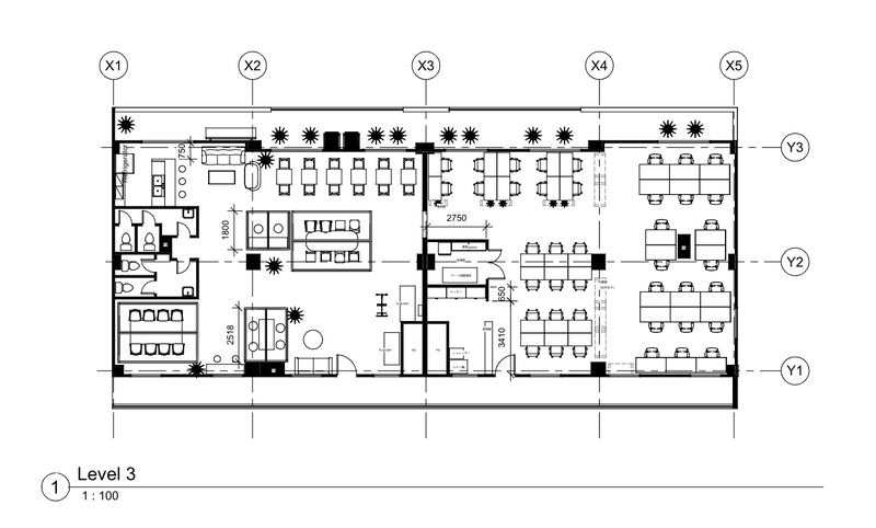 <図面左側半分のスペースはTOKO-FARM。FARMのようにクリエイティブのタネが育つ場所。メインエントランスや会議室、キッチンスペースなどがあり、コミュニケーションが生まれやすいように設計されている。