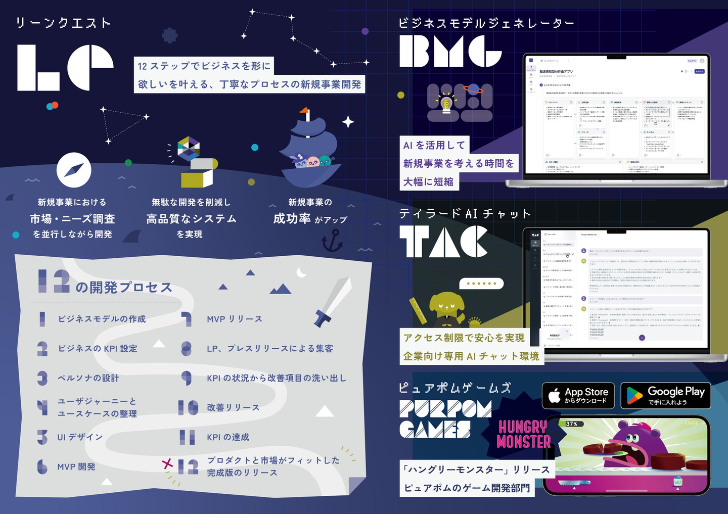 株式会社 Purpom Media Lab(ピュアポムメディアラボ)は、(1)新規事業開発支援 (2)生成AIサービス (3)海外向けゲーム開発 の3つの事業を柱に、MVP開発で低コストで短期間の開発を得意とする会社です。
