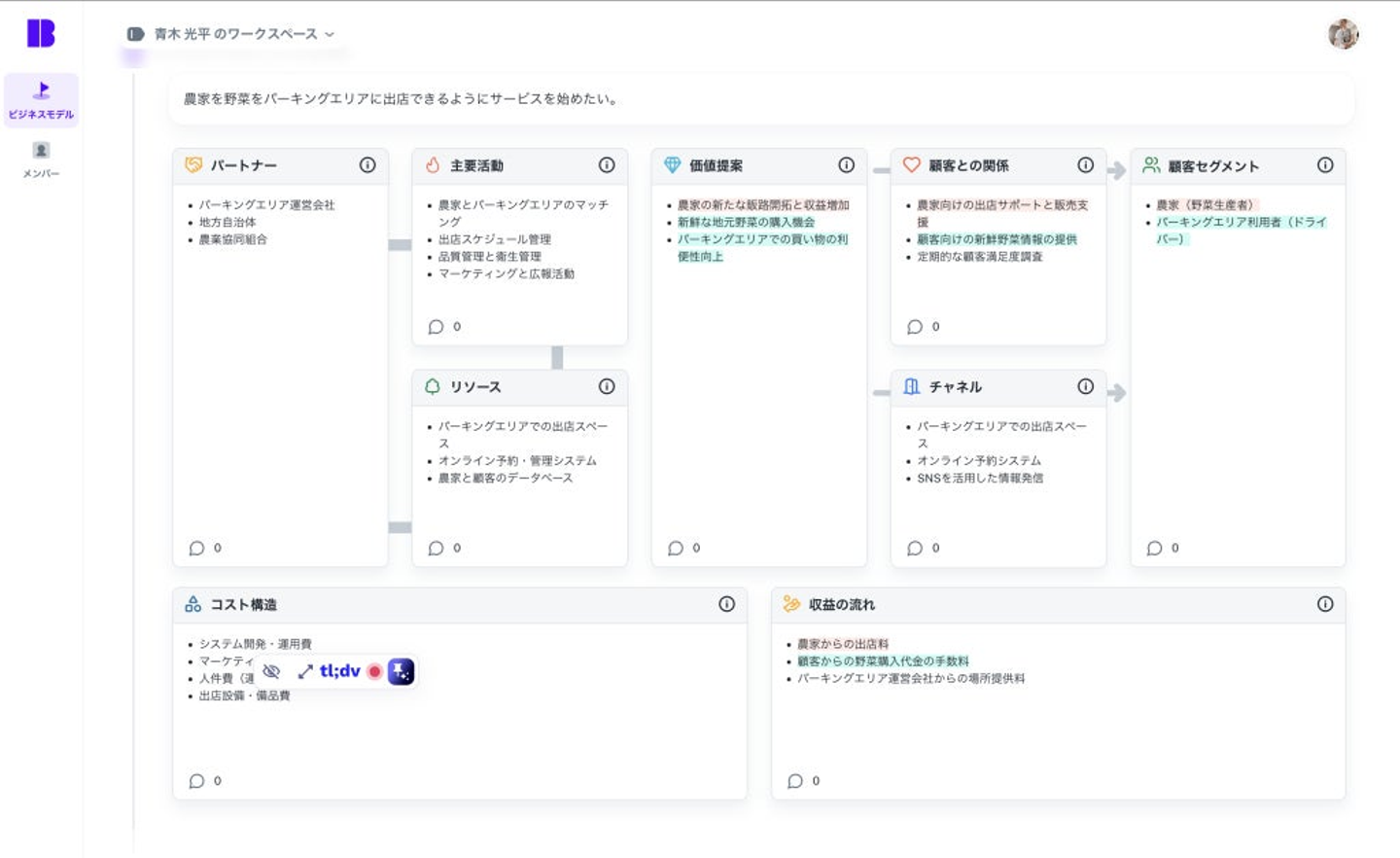 以下が生成されたビジネスモデルキャンバスの例です。こちらの例でビジネスアイデアは、「農家の野菜をパーキングエリアに出店できるようにサービスを始めたい」です。