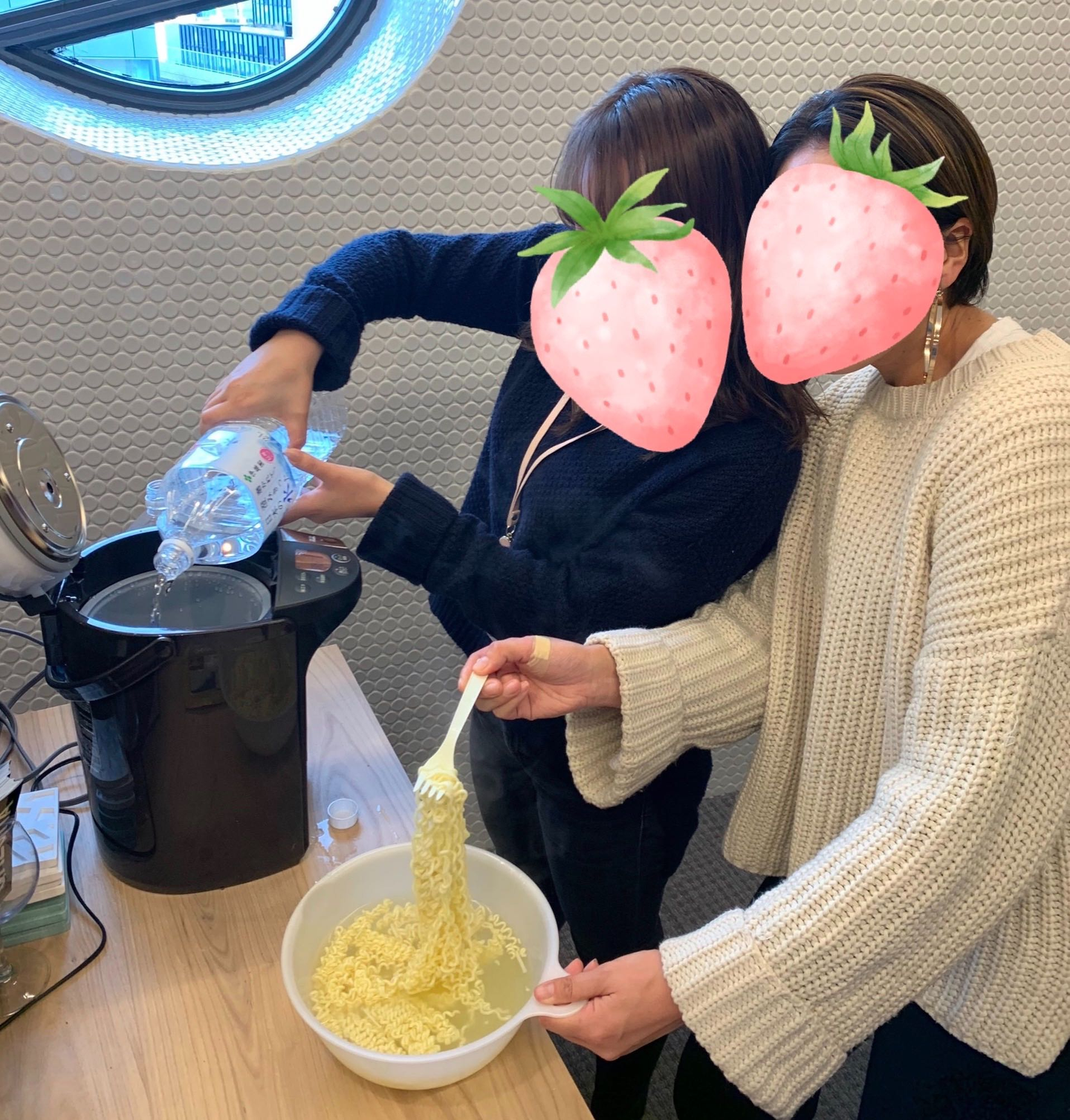 (👆ポットのお湯で麺をほぐす広報と人事)