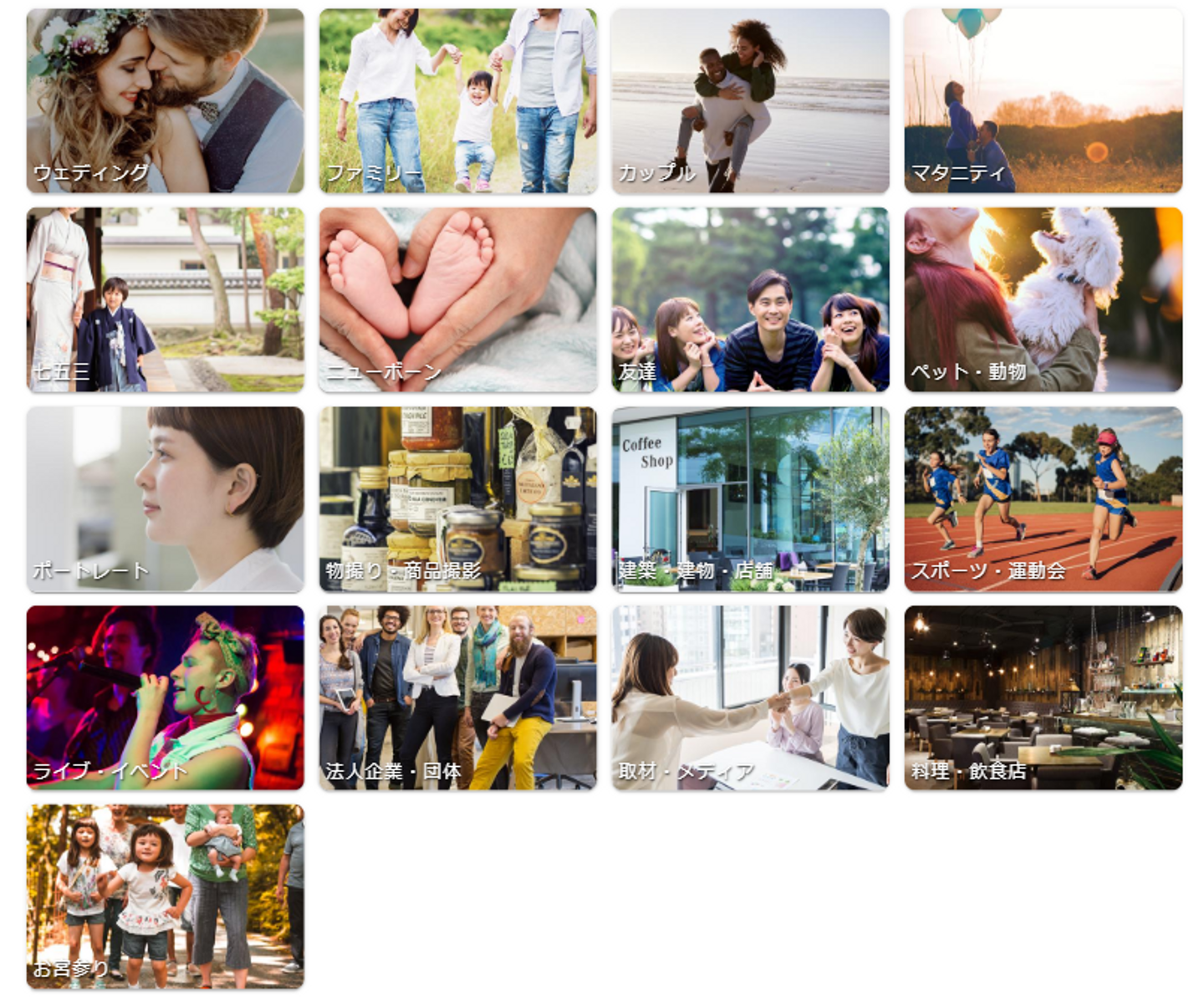 カテゴリーは他にも【ウェディング】【ファミリー】【七五三】【ペット/動物】【物撮り/商品撮影】【ポートレート】などなどたくさんあります!