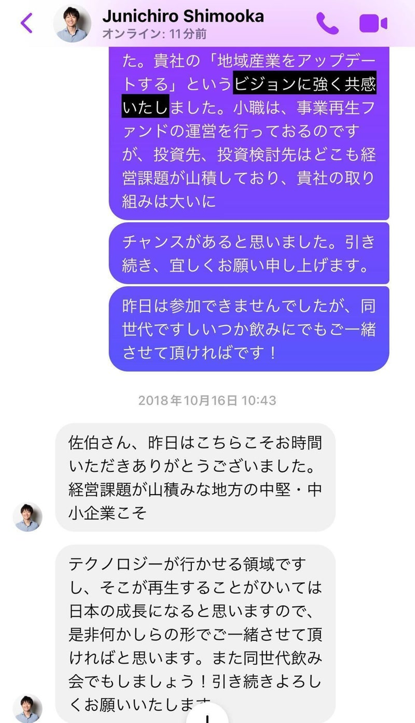 ちなみにはじめてプレゼンを聞いた翌日にメッセンジャーでこんなやりとりをしてました。2018年10月なので、クアンドが創業して約1年半の頃です。約半年間プロボノとして関与し(実際にデットファイナンスの設計、交渉、契約、着金を実施)、正式にジョインすることになりました。