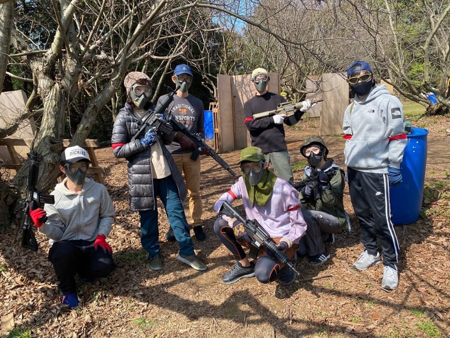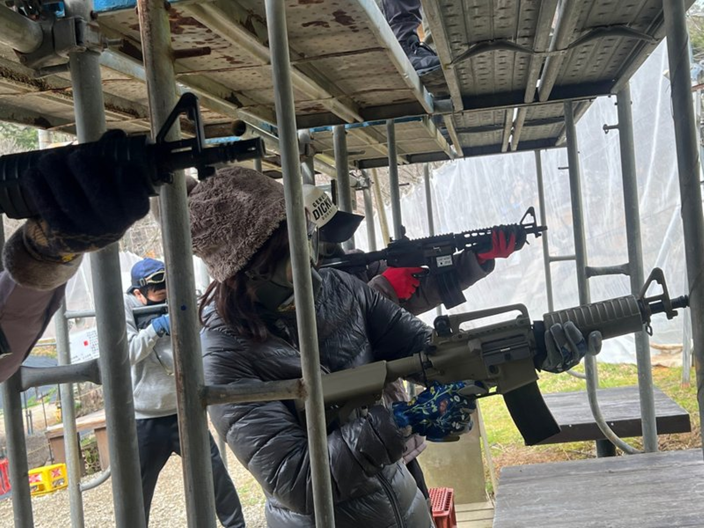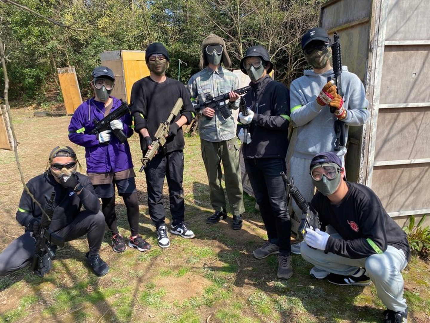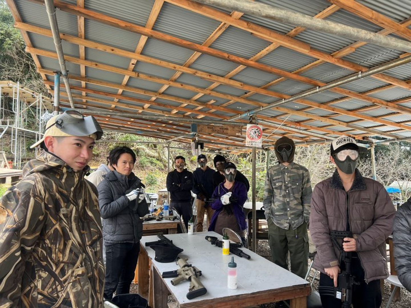 嵐チームは早々に高速道路に乗り込んだため、13時15分頃の余裕の到着。てっちゃんチームが到着した時には、既に戦闘モードでサバゲー用のライフルとマスクを手に持って待ち構えていました。