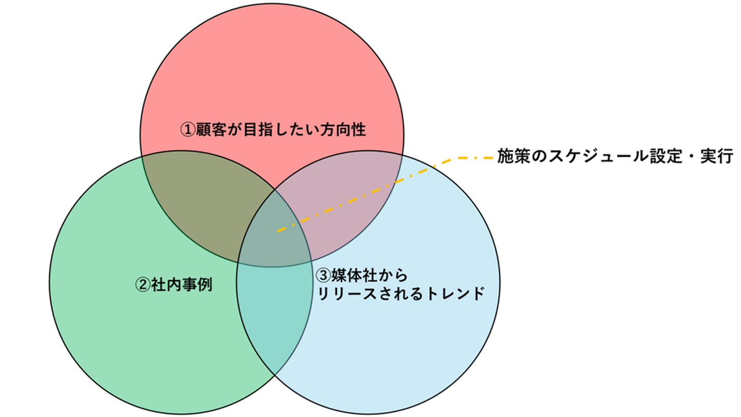 お客様の目指すべき目標を把握をした上で、媒体社からリリースされるトレンドを把握。把握した上で、社内事例を模索して運用方針とスケジューリング設定、顧客への共有と運用実行に移ります。