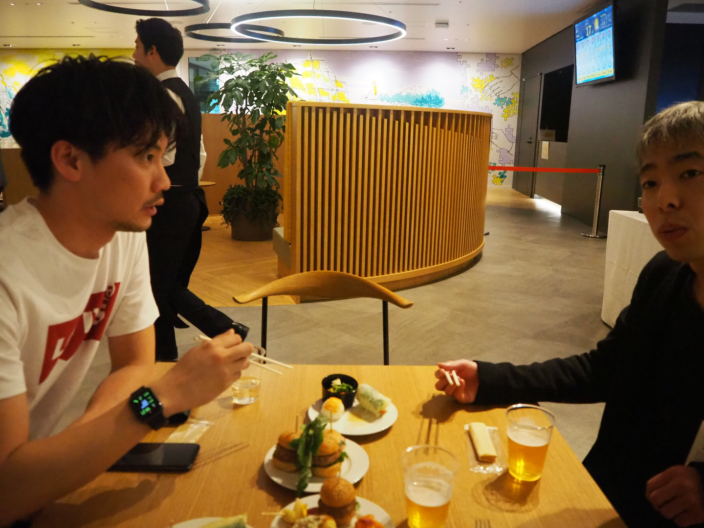 先に会場に到着していた私。その後代表・横町も到着し、始まるまで時間があったのでキャトルで乾杯しました。お酒好きなくせに弱いので、授賞式が始まる前に飲むと確実に酔っぱらうと思い、最初はジュースを。撮影のために来てると自分に言い聞かせてビールを我慢しました。(笑)