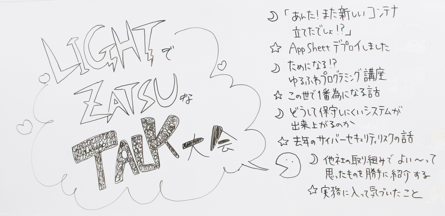 今回のテーマは「ZATSU(雑)」ということで、「 L(ライトで)Z(雑な)T(トーク)大会」を実施しました!