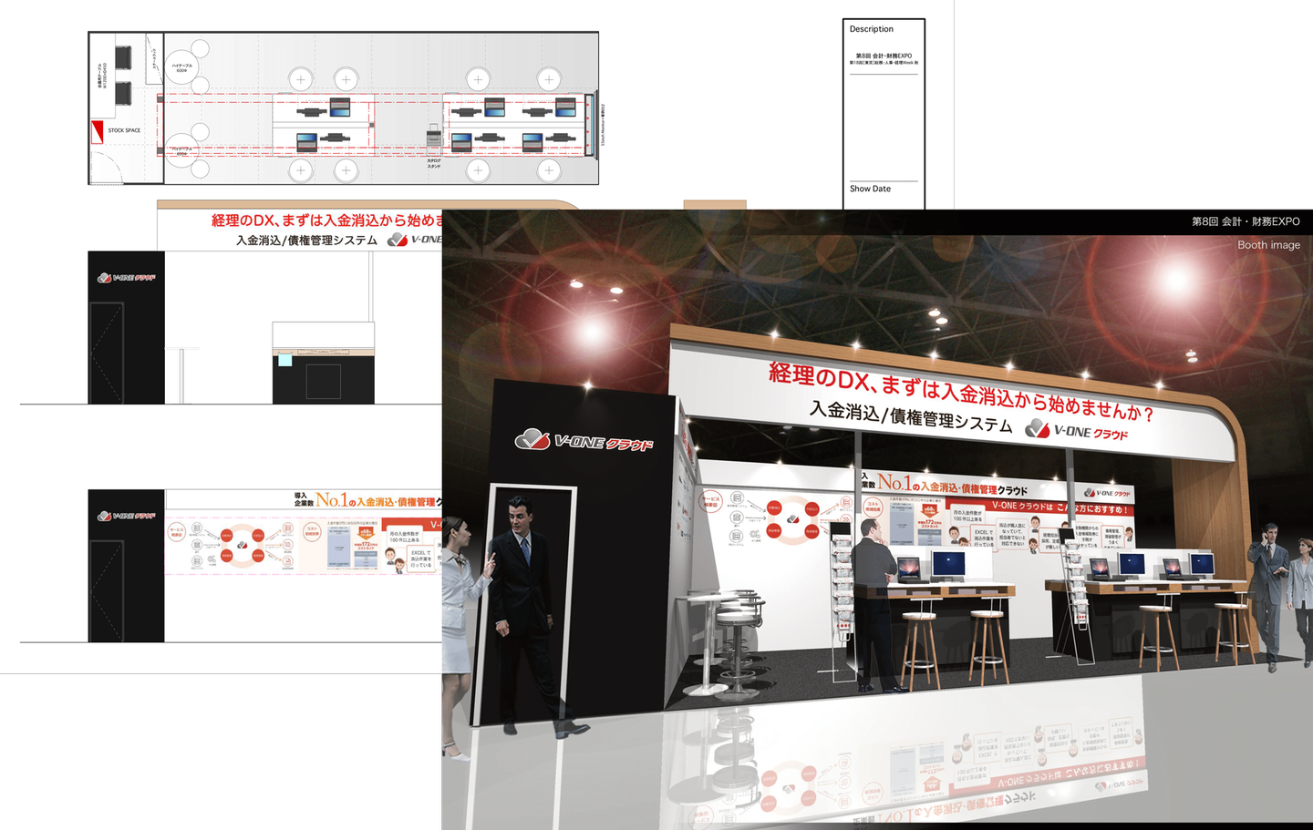 ブースデザインのプランと予想図。見せ方や図面など、細かなところまでしっかりと検討しています。