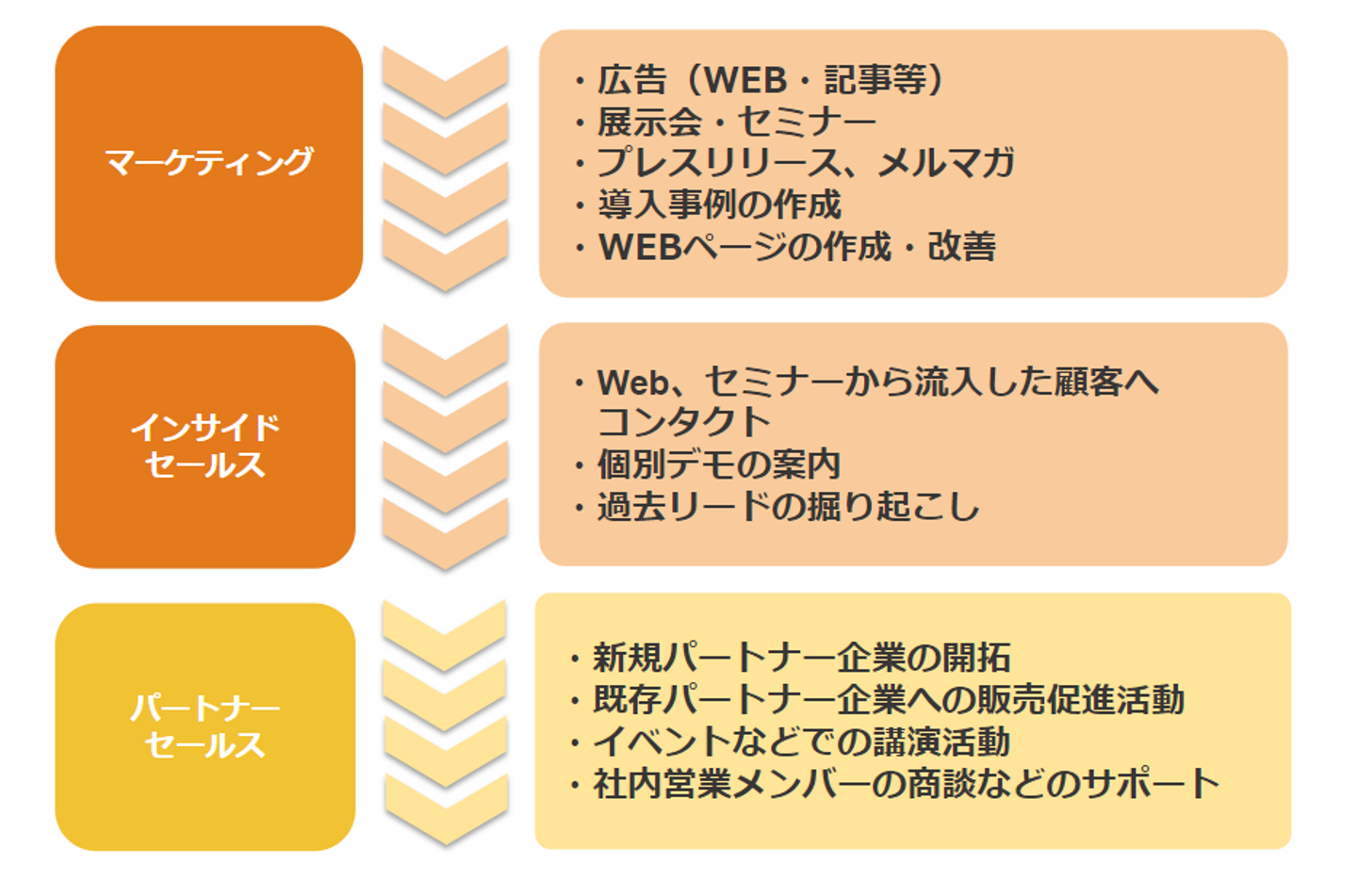 このフェーズを担当するのは、マーケティング・インサイドセールス・パートナー推進の各部門です。