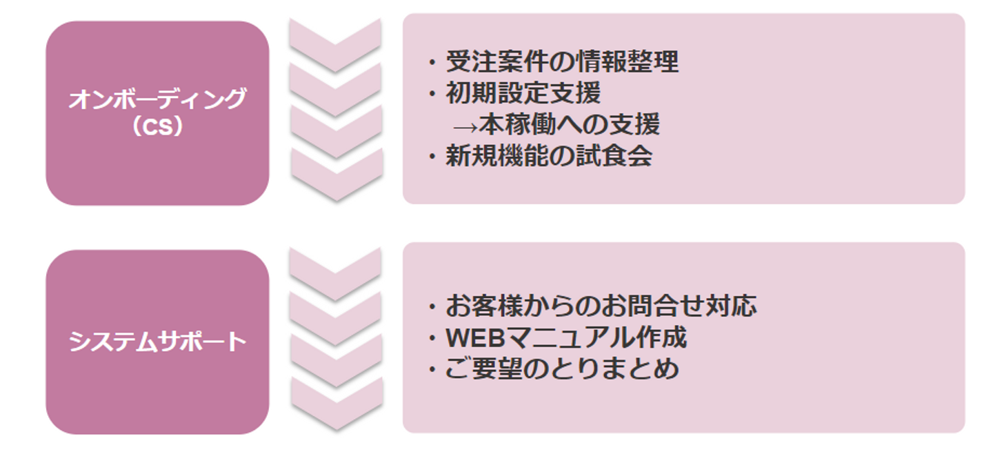 ご契約いただいたお客様へ、課題のヒアリング、製品・業務フローの操作説明、活用提案を行い、Victory-ONEを活用していただき、業務効率化をお手伝いすることがミッションとなります。