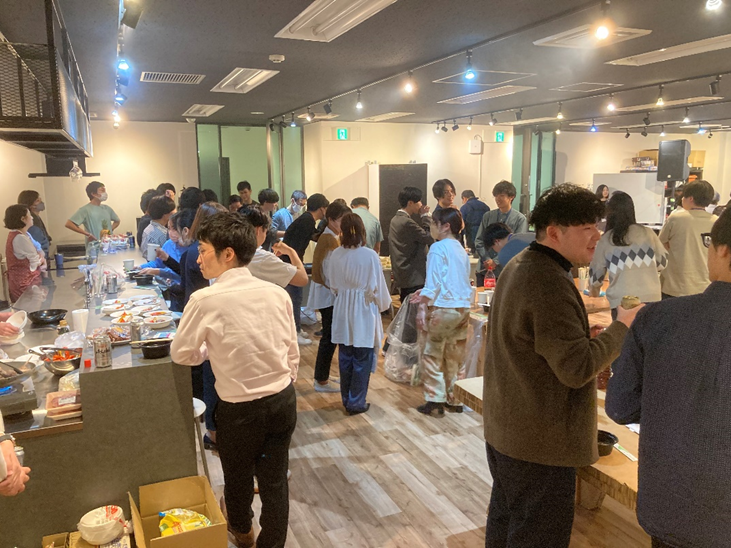 ラクーンでは大人数が集まる社内イベントのほとんどはオフィスの地下1階で行っています。立食パーティー形式で、部門や年齢関係なくお話しできる機会。