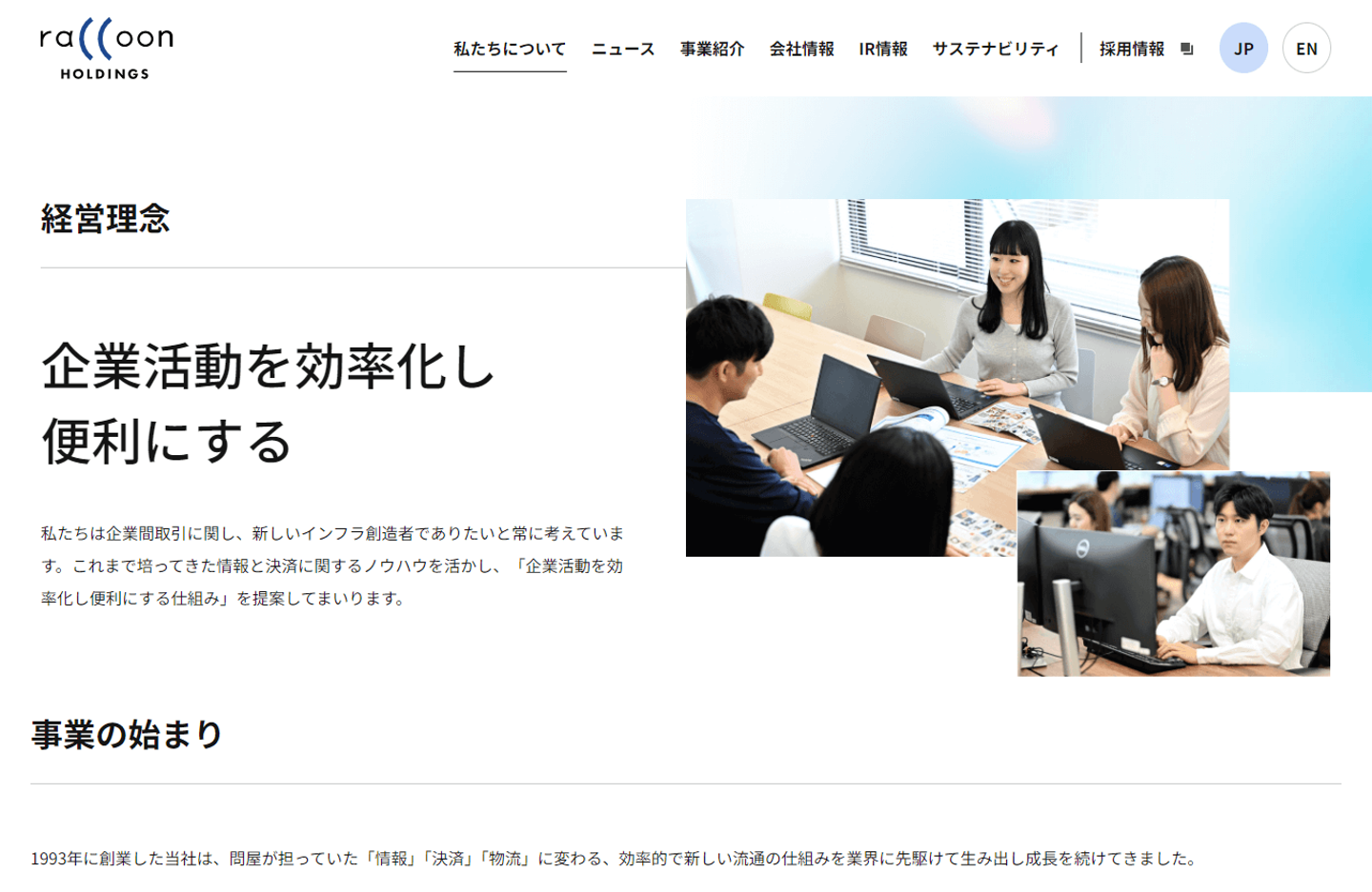 このページでは、先ほど登場したタグライン&ステートメント、経営理念やラクーンの歴史、代表からのメッセージをご紹介しています。ラクーンの事業展開の根底にある考え方や哲学、そして企業文化や価値観を多角的に理解していただけるよう、内容を充実させました。