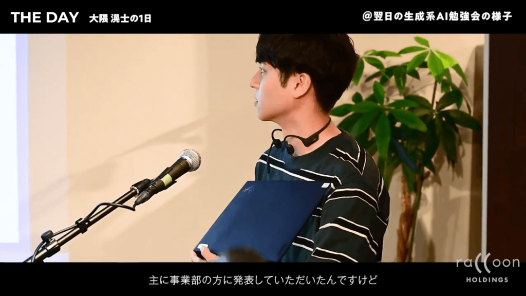 ちなみに、こちらは生成系AI勉強会の発表の様子です。 主に事業部の方に発表していただいたのですが、技術的なところに関しては僕が発表しました。発表後には投票で順位がつきます。1位になることはできませんでしたが、社長の小方から票をもらうことができてよかったなと思います。