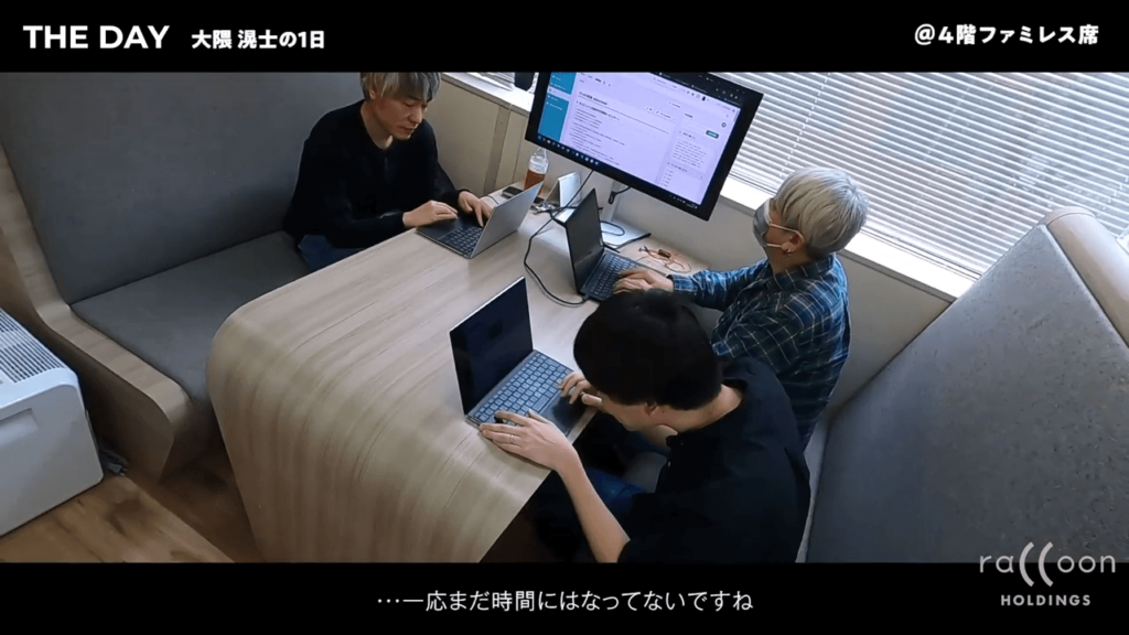 この日はデイリースクラムの後、チームでのミーティングがありました。 オフィスにはファミレス席があって、そこに集まってミーティングを行います。