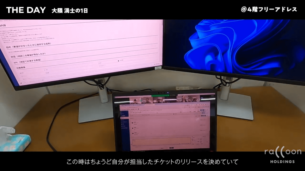まずは開発環境を立ち上げて、10時からデイリースクラムが始まります。デイリースクラムでは事業部と開発のメンバーが集まって、課題の進捗やいつまでに何をやるかを共有します。 このときはちょうど自分が担当したチケットのリリースの日を決めていて、その立ち合いを他の開発メンバーにお願いしているところです。