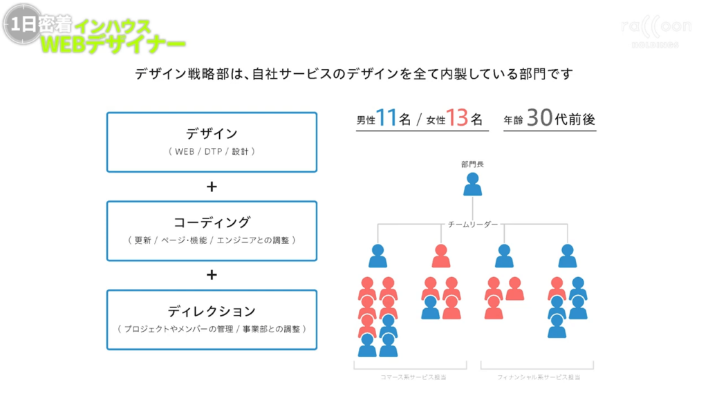 私はデザイン戦略部、第2チームのリーダーを務めています。デザイン戦略部は、デザイン・コーディング・ディレクションの3部門で分けて作業しているのですが、私はデザインとディレクションを担当しています。