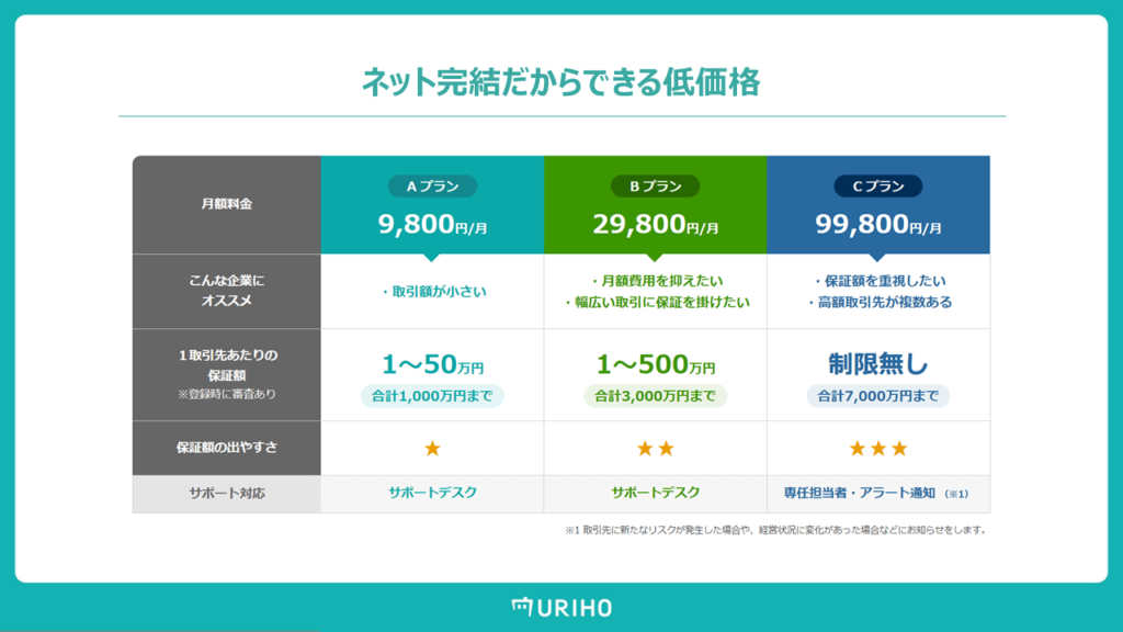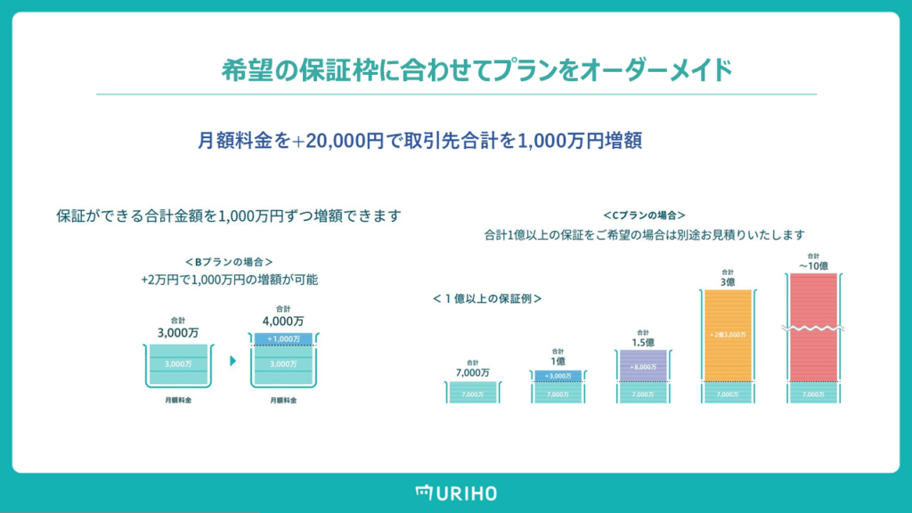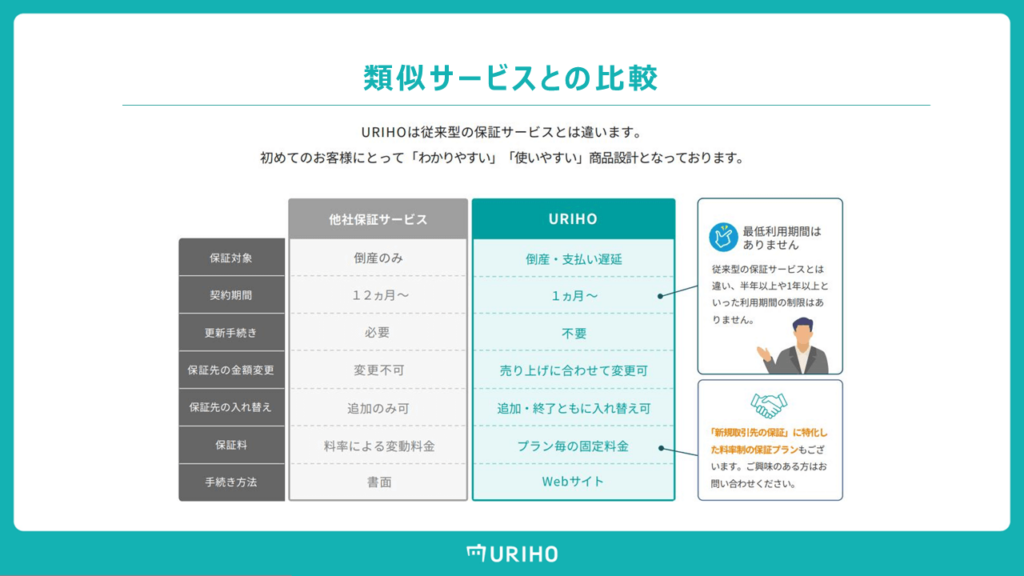 また、ウェブ完結のメリットを活かして、『手数料が安価であること』『一ヶ月単位で契約できること(一ヶ月単位の自動更新)』『取引先の入れ替えや保証額を柔軟に変更できること』などが『URIHO』と他社を比較したときの強みとなっています」