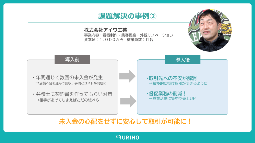 涌井「株式会社アイワ工芸様の事例では、未回収が発生した際、社長様が弁護士相談や回収作業に追われていました。