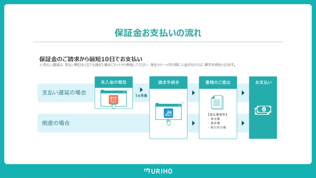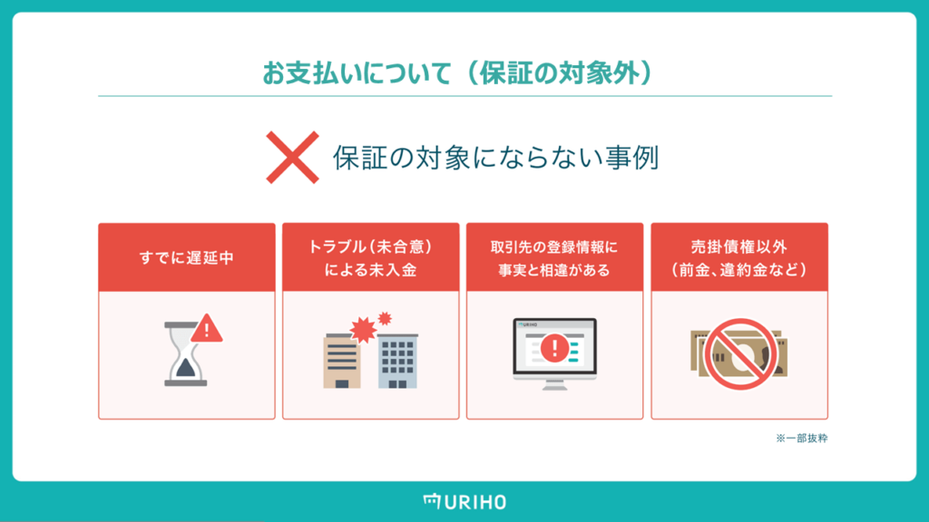 また、『保証開始前からすでに遅延している』『未解決のトラブルによって入金が遅延している』『URIHOに登録した取引先の情報に事実と相違がある』『売掛債権以外(前金や違約金など)である』などどいった場合も保証の対象外です」