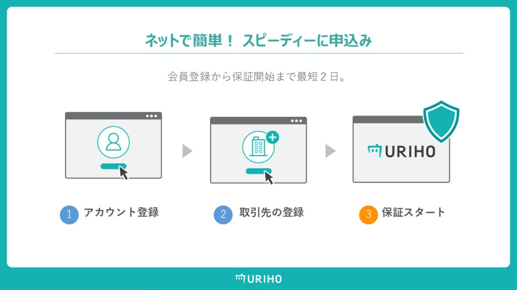 涌井「続いて、利用の流れをご紹介させていただきます。非常に簡単な仕組みとなっていて、次の2つのステップを行なっていただくだけでOKです。1つ目は『URIHO』のアカウント作成、2つ目は保証をかける取引先の登録です」