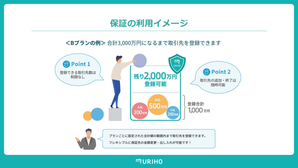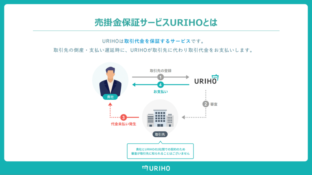 そもそも『売掛金保証サービス』とは、取引先が支払えなくなった際に代わりに保証金を支払う仕組みのことを指します。取引先が倒産や支払い遅延を起こした場合でも、事前に審査を通過していれば『URIHO』が代わりに保証金を支払います」