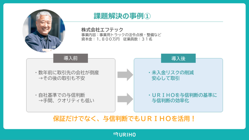 株式会社エフテック様では、『URIHO』で保証をかけることでリスクを抑えつつ、取引先を拡大し、売上を獲得することができています」
