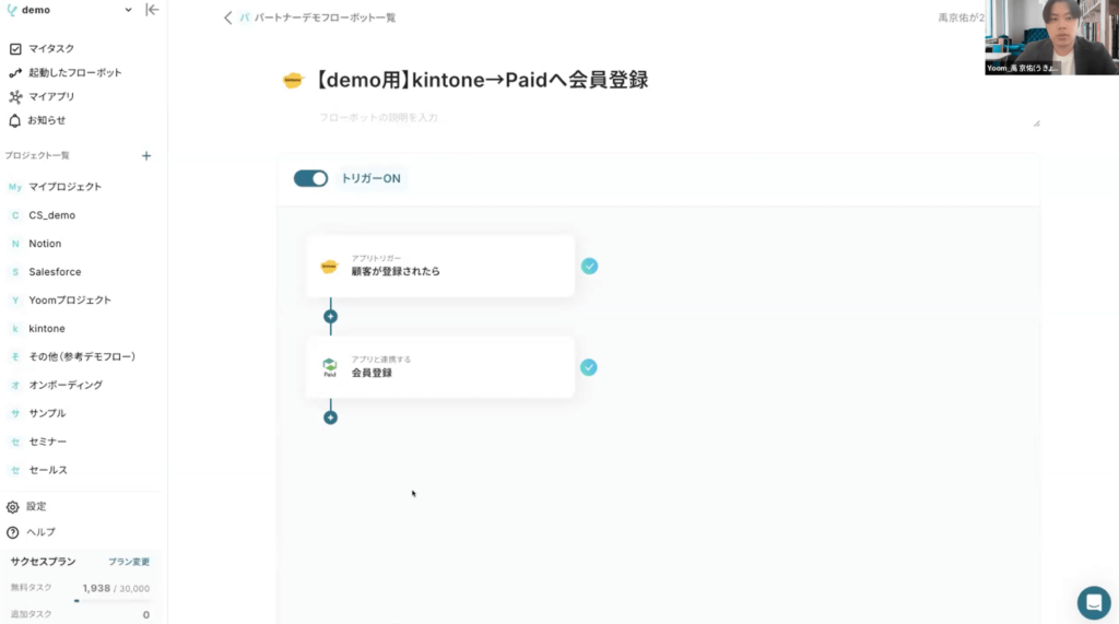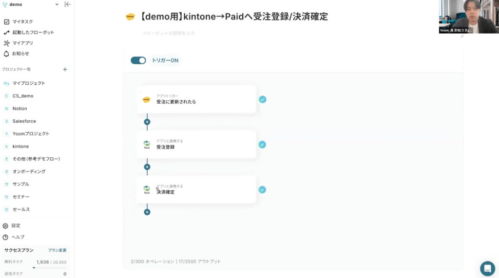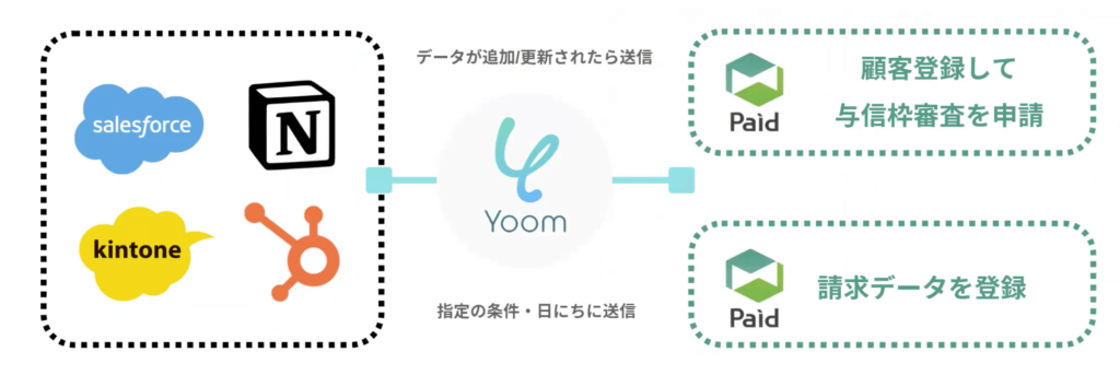 禹さん:「例えば、『Yoom』を活用して『kintone』と『Paid』を連携させた場合を考えてみましょう。『kintone』に取引先の顧客情報が登録されると、『Paid』にも自動的にその情報が登録されるような使い方ができます」