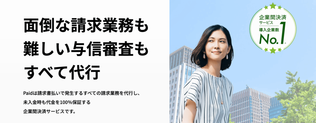 「Paid(ペイド)」、請求書払いで発生するすべての請求業務を代行し、未入金時も代金を100%保証する企業間決済サービスです。