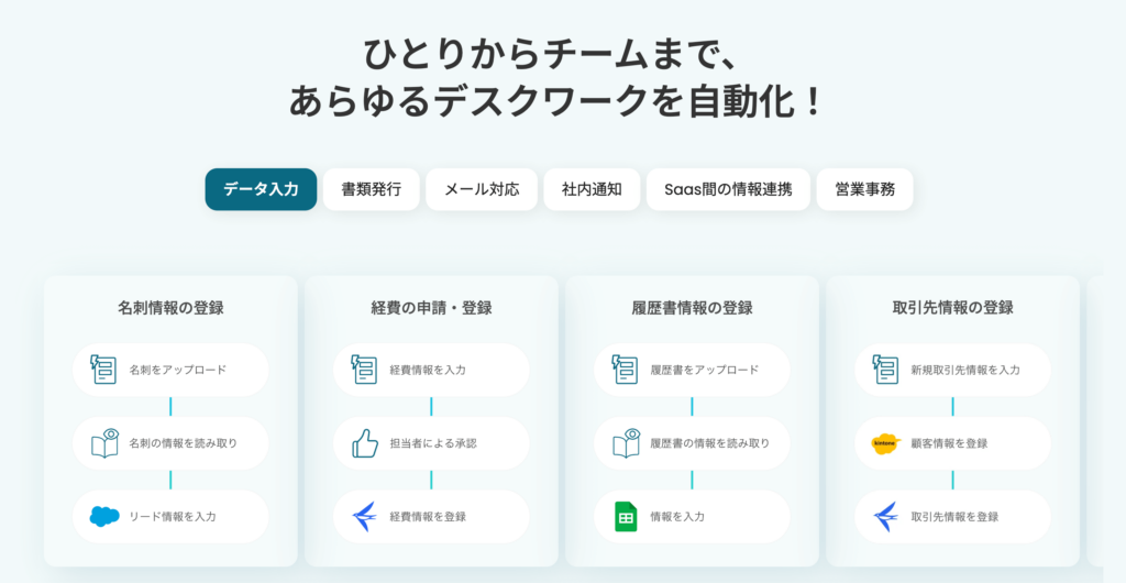 従来のRPA(パソコンで行っている事務作業を自動化するソフトウェアロボット技術)だけでは実現できなかった繰り返し発生する事務作業の多くを、ノーコードで簡単に自動化することが可能です。現在、Paidも含めた400種以上のアプリ・サービスと連携しています。
