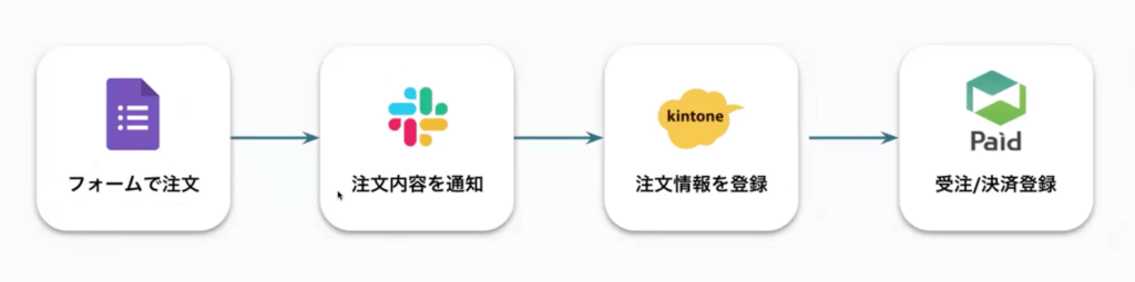 禹さん:「応用編②として次のようなことも可能です。この場合、『Googleフォーム』で注文が入ると、注文情報がチャットに通知され、それと同時に注文情報が自動で『kintone』に登録され、『Paid』で受注登録と決済確定が実行されます」