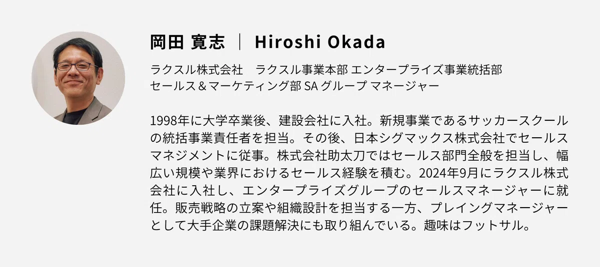 岡田: 「売上を上げ続ける組織」を作りたいと思っています。一時的に売上を伸ばすのは多くのセールスが経験していることだと思います。しかし、それを仕組みとして定着させ、持続させることができるのは組織の力です。売上を上げ続けるということはお客様から支持され続けるということです。エンタープライズ領域は俗人化しやすいですが、個人に依存せず成果を出し続け、お客様に応え続けられる組織にしたいですね。