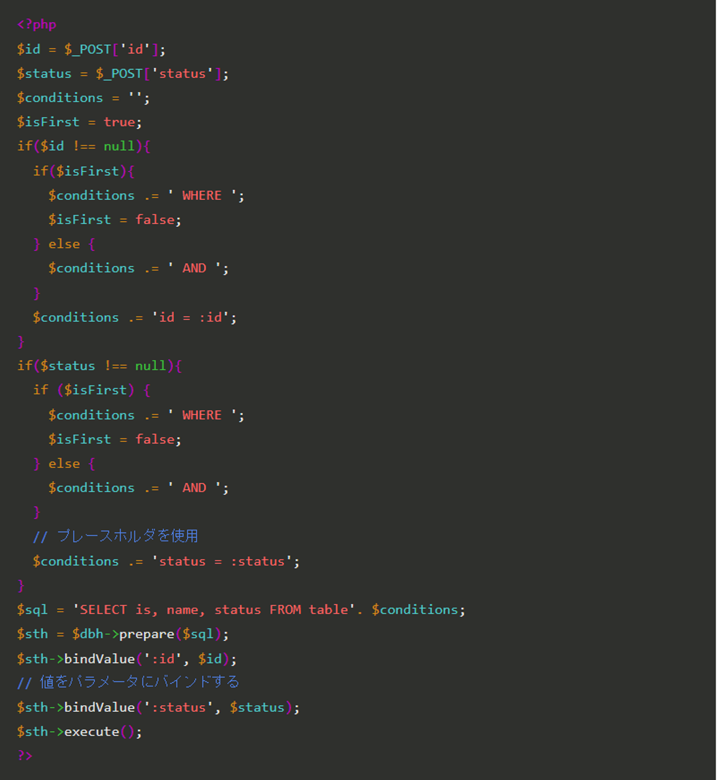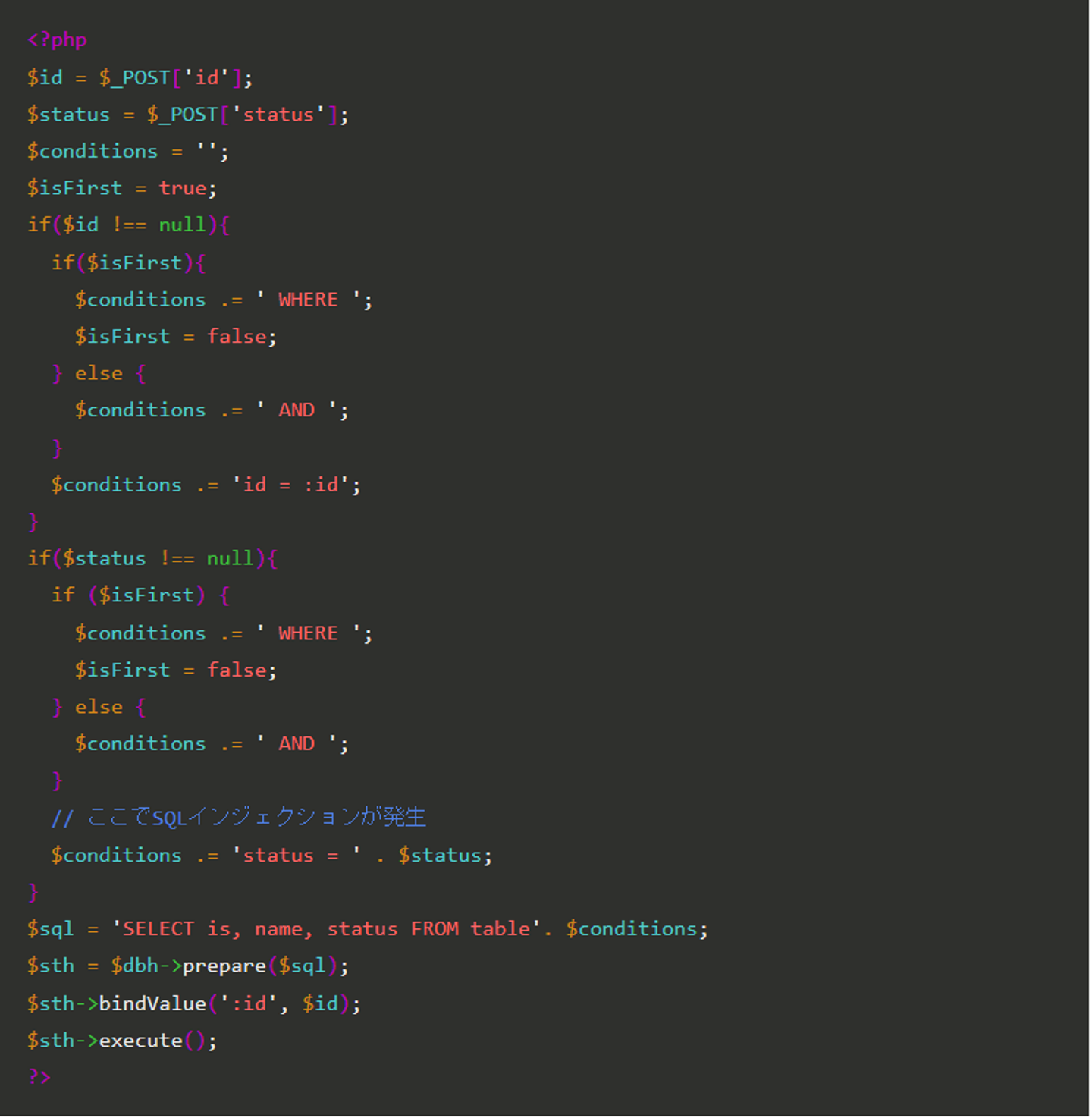 SQLインジェクションが発生した原因などは次で説明するとして、まずはSQLインジェクションが発生してしまったソース例を示します。