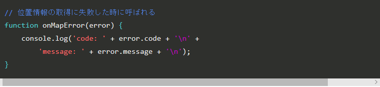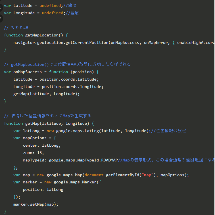 最初に呼び出すgetMapLocation()で、「Geolocation」プラグインを利用して現在位置を取得しています。成功するとonMapSuccess、getMap(latitude, longitude)と処理が進んでいき、最後に現在位置を示したMapが表示されるようになります。 関数の意味が分かれば、こちらも内容自体はさほど難しくないでしょう。