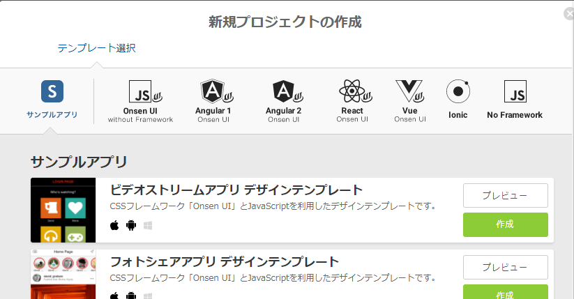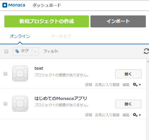 最初にダッシュボードを開くと「はじめてのMonacaアプリ」というプロジェクトが既に作成されています*2が、まずは自分で新たにプロジェクトを作ってみましょう。