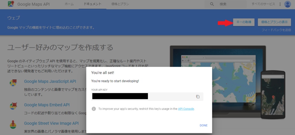 Googleアカウントでログインしてから、APIのページの右上にある「キーの取得」をクリックして32文字のAPIキーを確認してください。