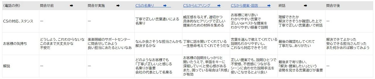 そして、そのようなお客さまに対してCSはどう対応すべきか、それによりお客さまの気持ちがどう変化するかを時系列に分かりやすい表現で解説しています。