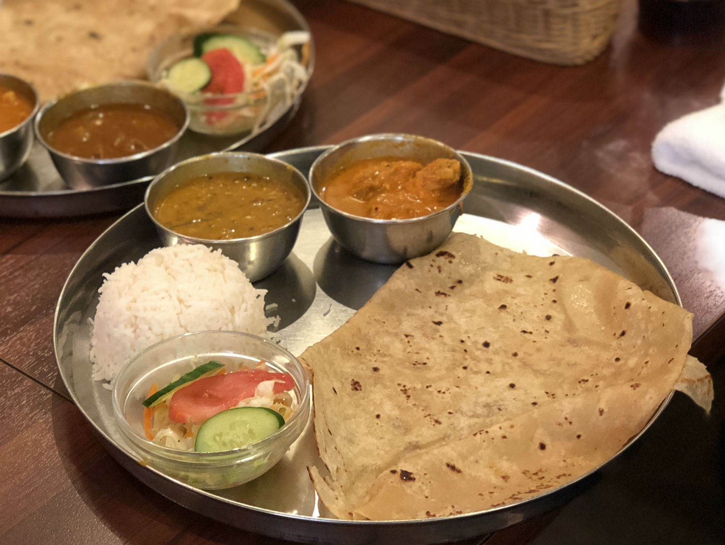 セットにはチャパティかナン、ライス、サラダ、ラッシーがついてきます。この日の日替わりカレーはマトン大根カレー(辛口) 、ジンジャーチキンカレー(中辛) 、ムンケダル(豆)カレー(一番辛くない)。インドカレーというとナンのイメージが強いですが、全粒粉の薄焼きパンのチャパティで食べることも多いそう。あとからナンもおかわりできるということだったのでまずはチャパティで注文。