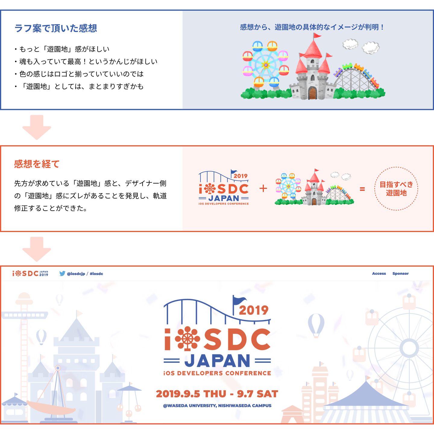 大きなモチーフとしてジェットコースターをもとに、「iOSDC」の「O」の文字を観覧車というカタチで表現することで、「遊園地」らしさをユーザーに伝えられるデザインにしました。