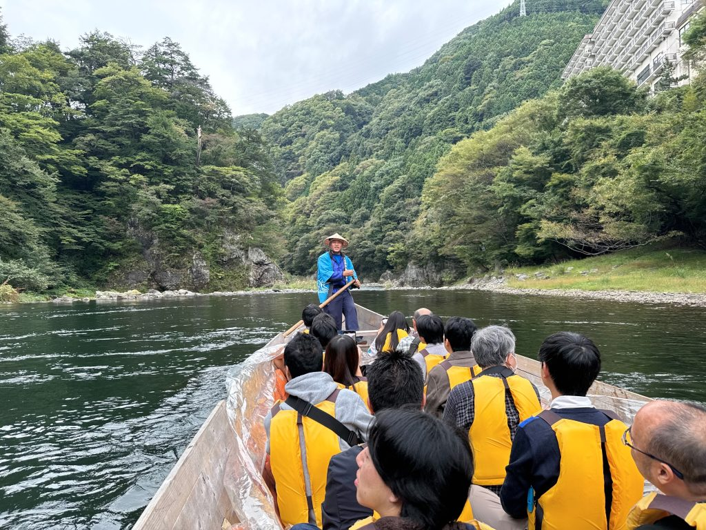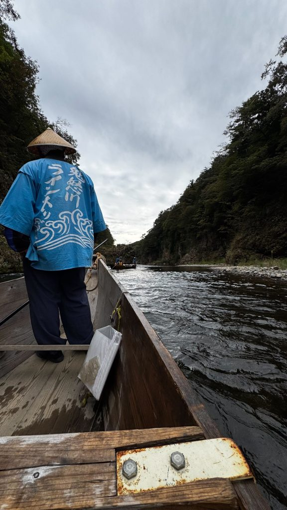次は鬼怒川ライン下りです。台風22号と23号に挟まれた日程だったため悪天候も覚悟していましたが、当日は雨も降らず風も穏やかで、自然の中でゆるやかな川の流れに癒されました。
