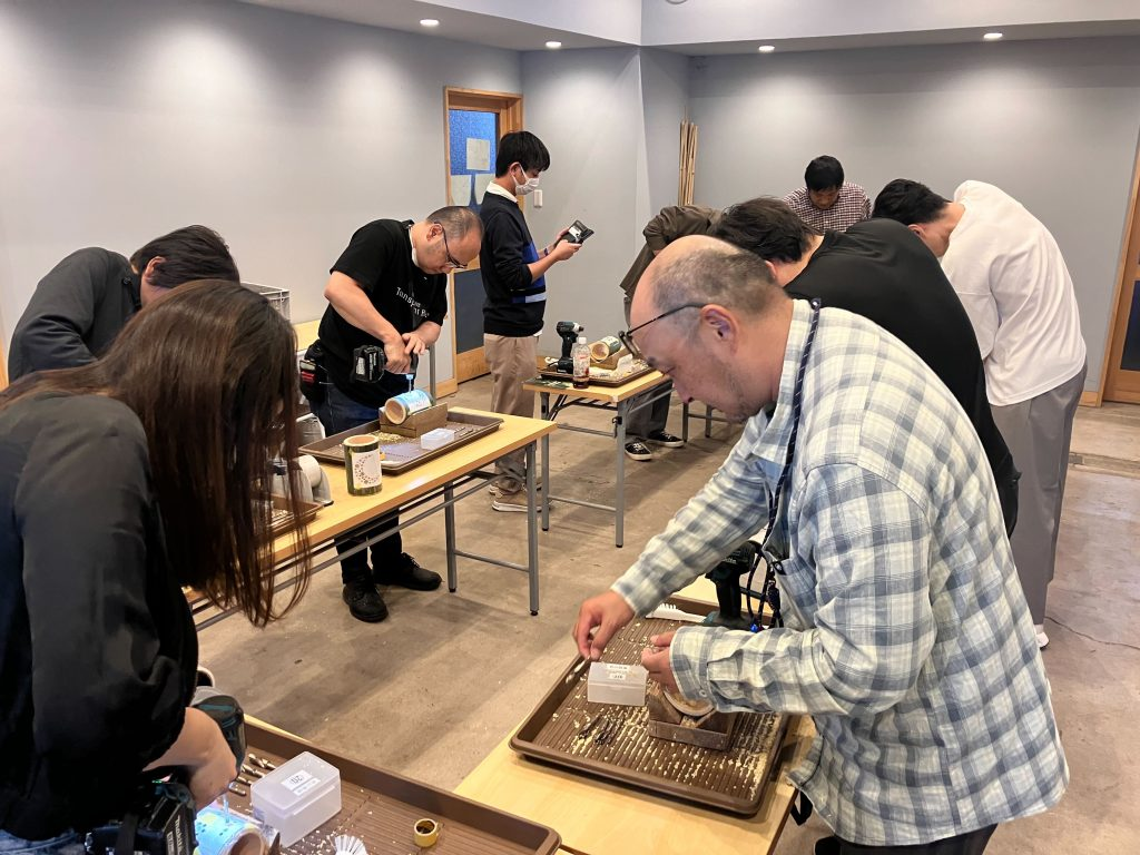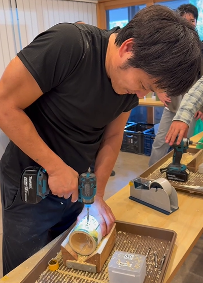 竹灯りの模様は、大・中・小のさまざまな口径のドリルで穴をあけて作ります。模様が多い人は、たくさん穴をあける必要があるため大変そうでした(笑)