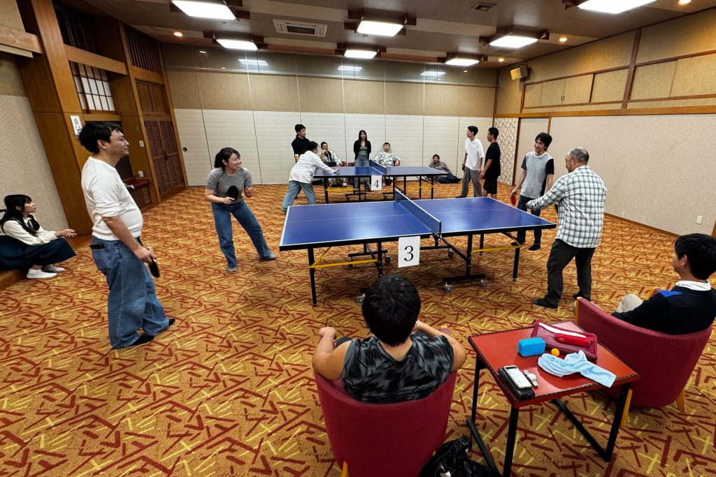 温泉卓球大会では、卓球経験者と未経験者が混合ダブルスで戦い、大いに盛り上がりました。優勝は、相原さん&犬井さんペア(あいいぬペア)!また温泉卓球大会を開催したいですね。