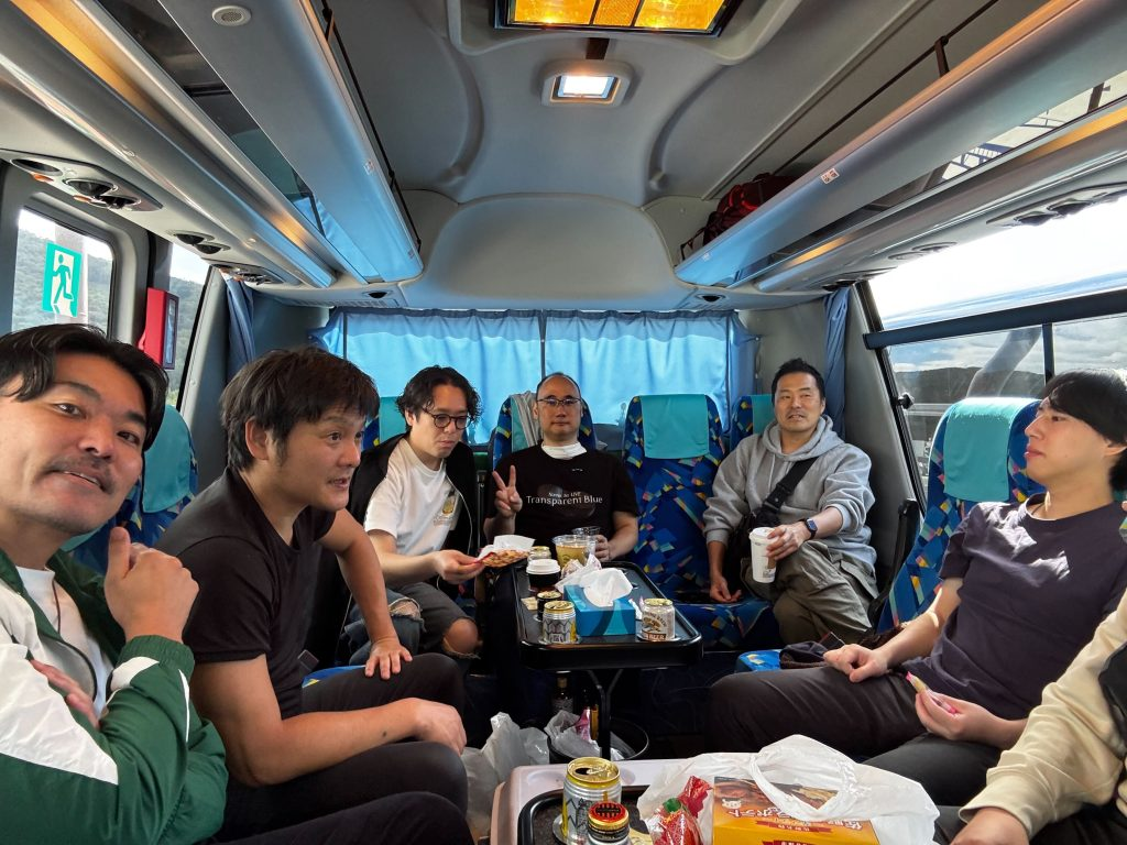 バスの後部座席はサロン型でお酒も完備されていたため、後ろの席では朝からプシュッとやっていました!
