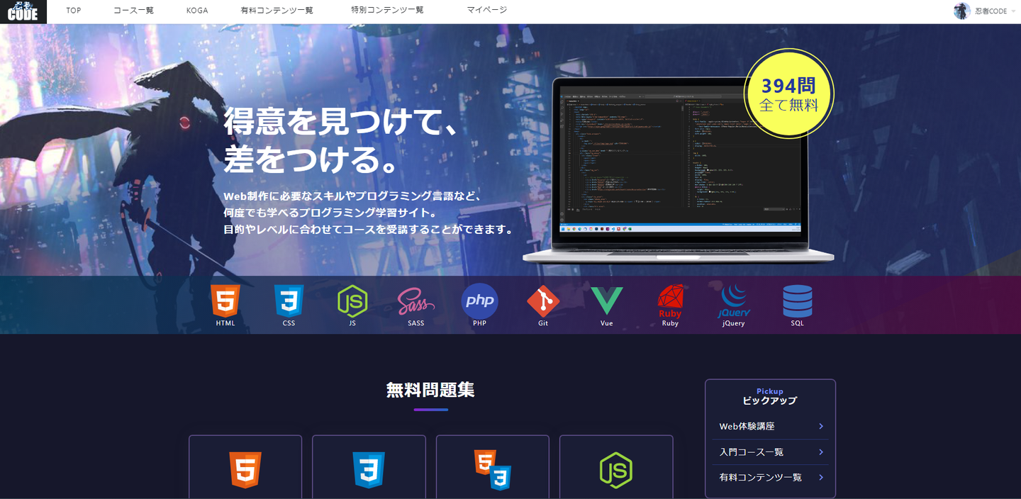 未経験からでもWeb制作の実務的なスキルを学ぶことができる、サポート付きオンライン学習サービスです。現在の内容としては400本以上の学習動画や実践問題集となります。独学でWeb制作を学ぶには専門用語があまりにも多すぎて、挫折する人が多い状況が一般的な学習サービスです。しかし「忍者CODE」は、わかりやすさにこだわった学習動画やベテランエンジニアによるチャットサポート体制も充実しているので、挫折せずに長く続けられるサービスとなっています。また受講期限なしのサービスのため自らのペースで続けることができるのが特徴です。何より上記の内容が業界最安基準で提供されています。