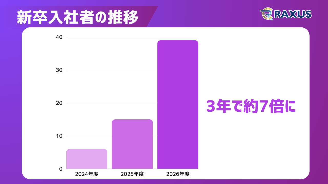 ここ数年、当社の新卒採用は着実に拡大を続けています。その背景には、会社の規模や事業の成長に応じて「どのような人材が次の挑戦を支えるのか」を常に問い直してきた姿勢があります。結果として、当社が描く成長戦略を担う人材の層は年々厚みを増し、多様なバックグラウンドを持つ仲間たちが次々と加わっています。