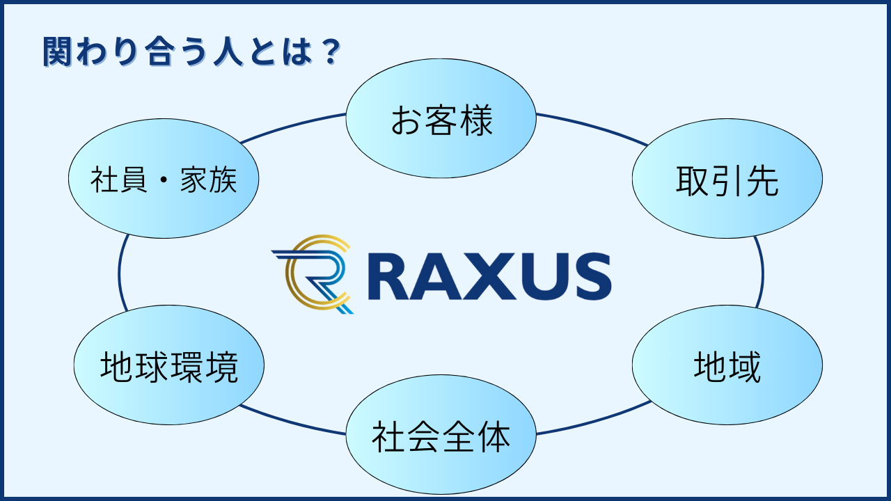 私たちのこだわりは「新たな価値の創造と関わり合う人が幸せになること」です。「関わり合う人」とはサービスを提供するお客様はもちろん、それらを共に提供している取引先、地域社会、ラグザスの社員やその家族などラグザスを取り巻くすべての人・コトを指しています。