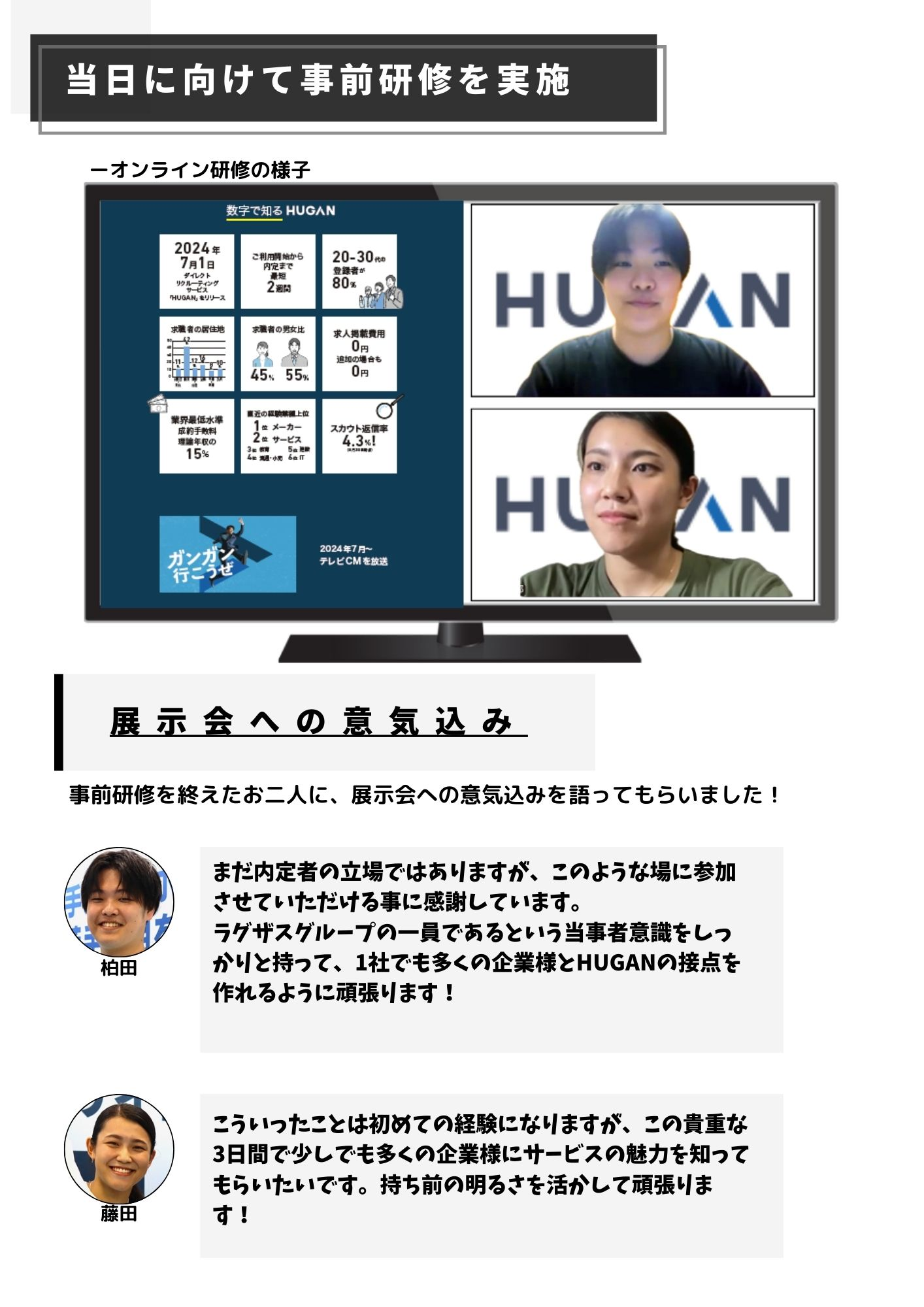 藤田:展示会前と展示会後では入社への意識がめちゃめちゃ変わりました。私は他の内定者の方や社員の方と会う機会があまり無かったので、働くイメージがそんなに持てていなかったんですよね。ラグザスグループの事業についても表面上は知っているけど、正直あまり分からないなと感じていました。今回HUGANというサービスについて理解が深まったことで、会社や働くことへの解像度がかなり上がりました。若手から挑戦させてもらえる環境だとは思っていましたが、この3日間を通してそれを肌で感じ、挑戦させてもらえるというよりも、挑戦したくなる環境だと思いました。今は、早く入社したい、早く仕事がしたいと思っています!