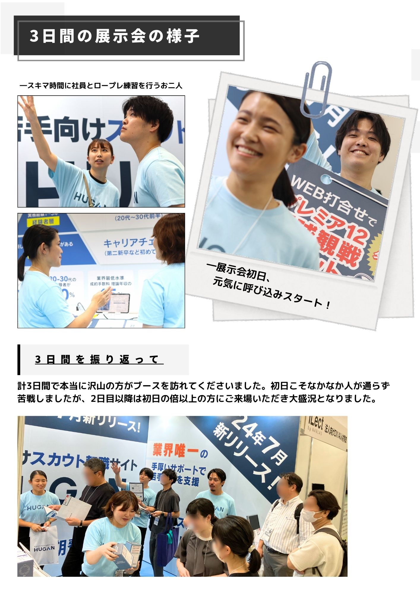 リリースからの短期間で急速に利用企業数も増加していますが、HUGANは更なる事業拡大を目指すフェーズを迎えています。イベントを通じてより多くの企業と接点を持ち、挑戦する人が活躍できるフィールドを更に広げるべくブース出展をいたしました。